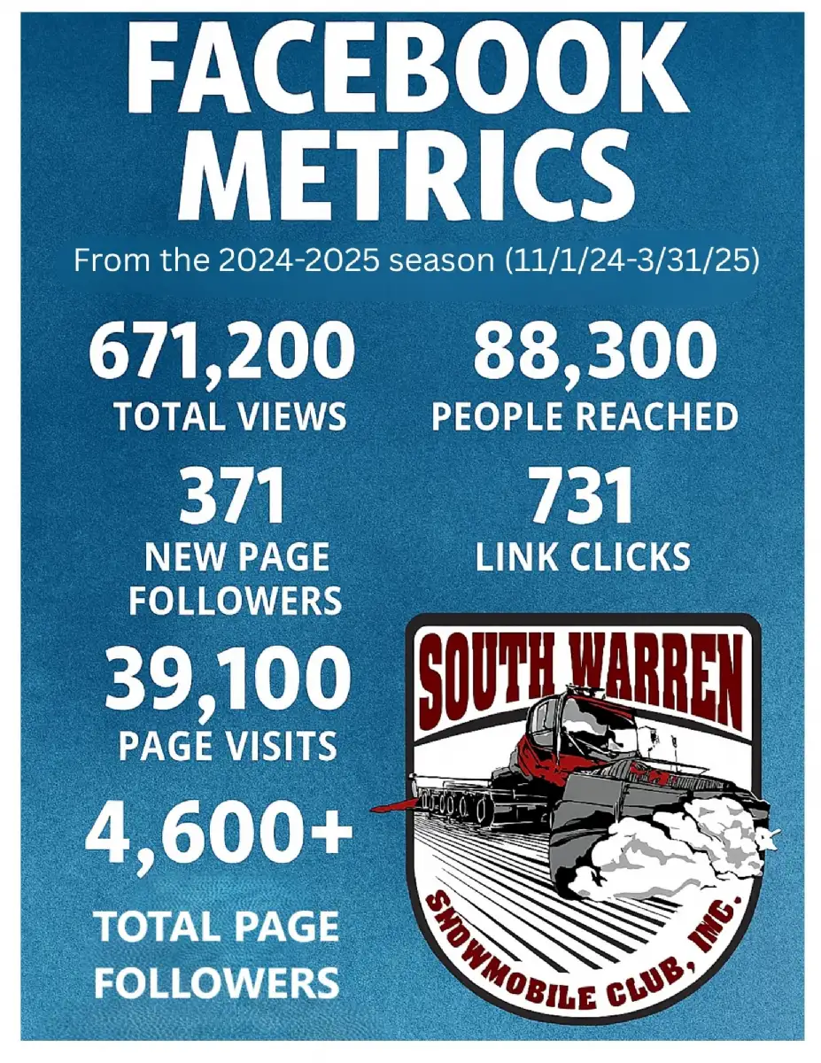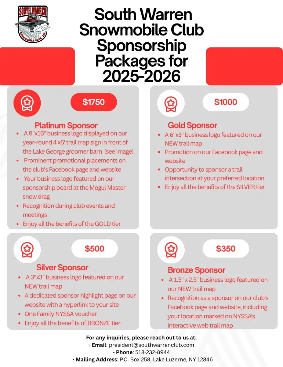 Join the South Warren Snowmobile Club as a sponsor for the 2025–2026 season and ride with us into a season of visibility, impact, and community pride.